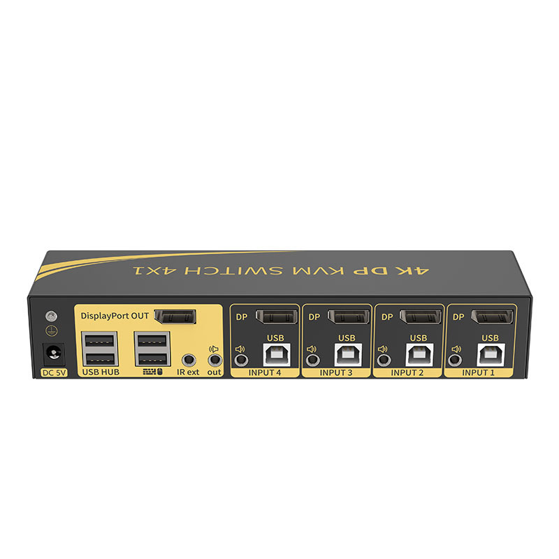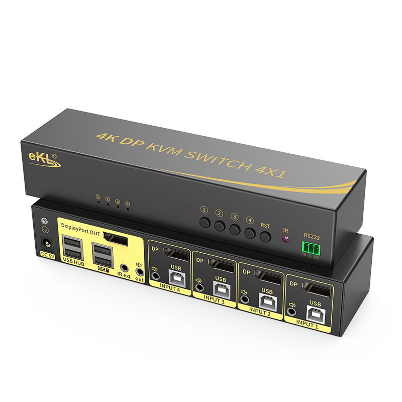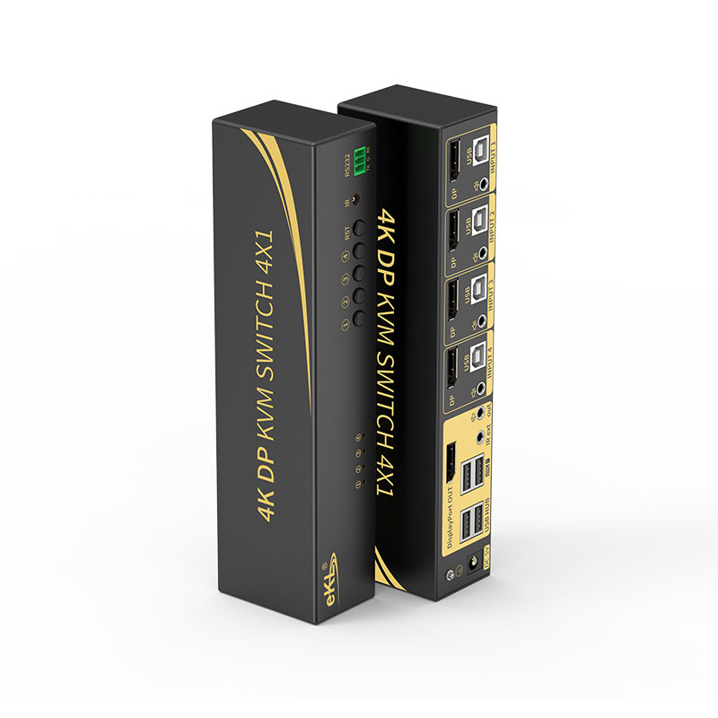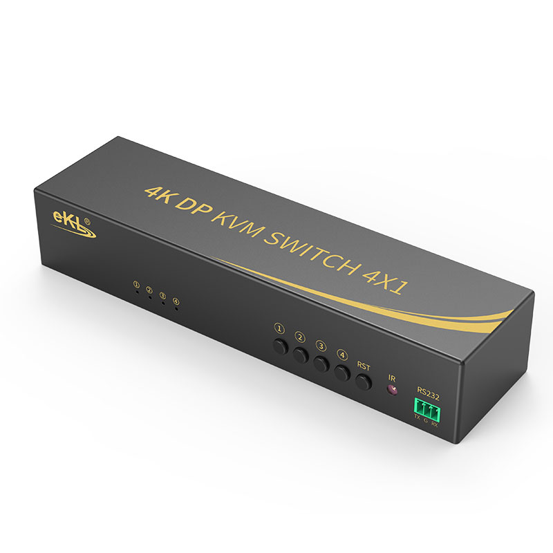DP KVM切换器41DP支持DP1.2协议、自适应EDID显示,分辨率最高可达到3840x2160P@60Hz;采用4进1出设计,共享1套键盘鼠标、打印机、U盘等USB设备;开箱即可使用