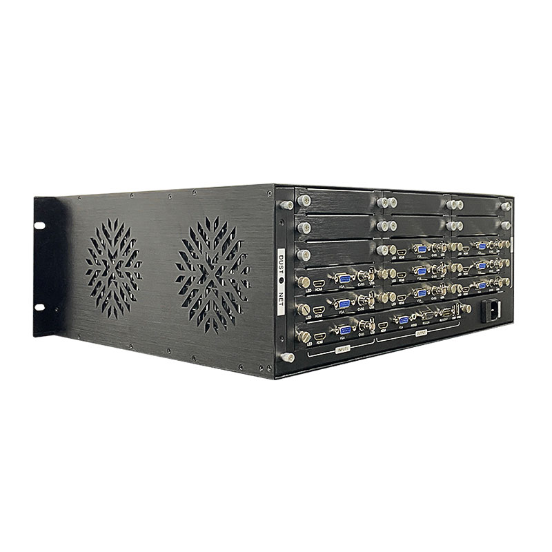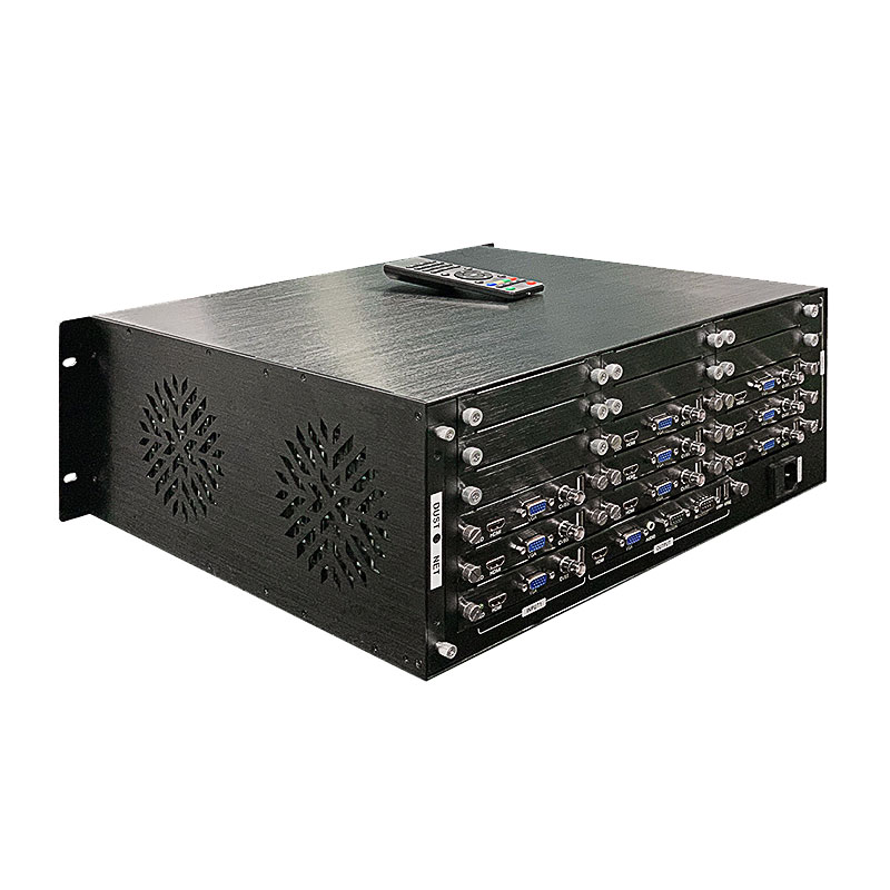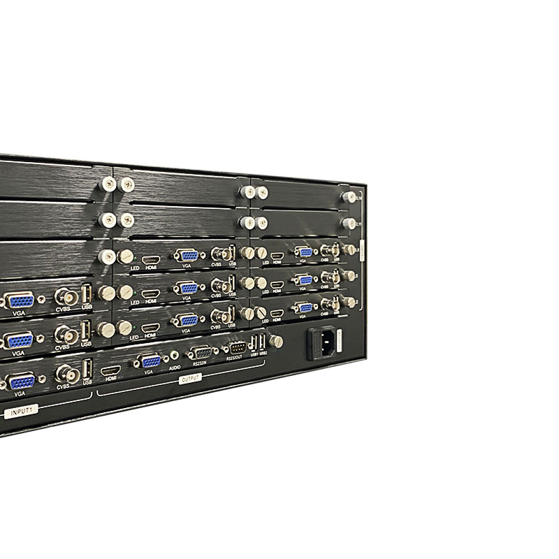 9路HDMI画面分割器VS09采用高清插卡式设计,9张插卡中的每一张都支持1路HDMI信号+1路VGA信号+1路BNC信号+1路USB信号输入;可接1套键鼠,支持1路HDMI+1路VGA+1路3.5mm立体声音频输出